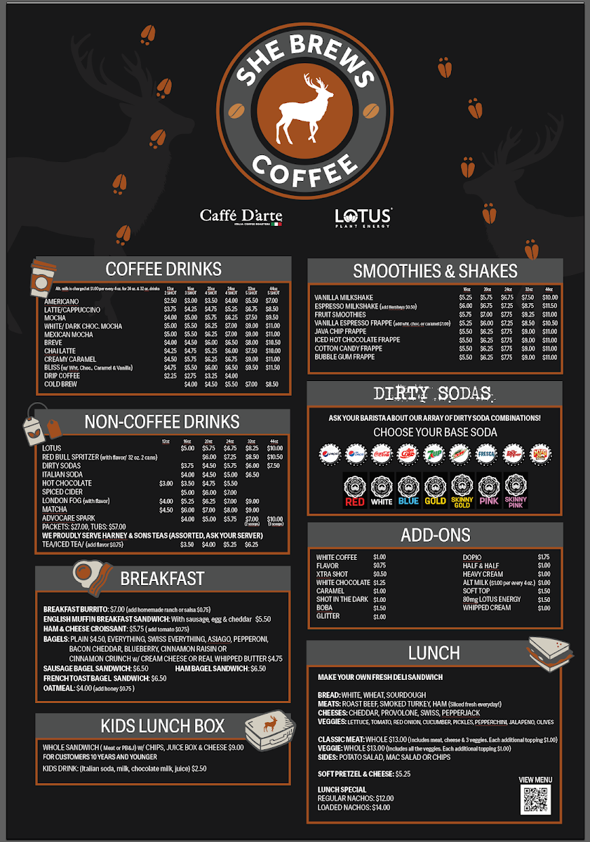 Welcome to SheBrews Coffee on Custer, located at 1100 W Custer Ave in Helena, MT. This charming haven offers a menu brimming with delightful beverages and nourishing bites. Start your day with a velvety Dark Chocolate Mocha or indulge in one of their creative smoothies and shakes, like the Bubble Gum Frappe or a classic Vanilla Milkshake for just $5.25.